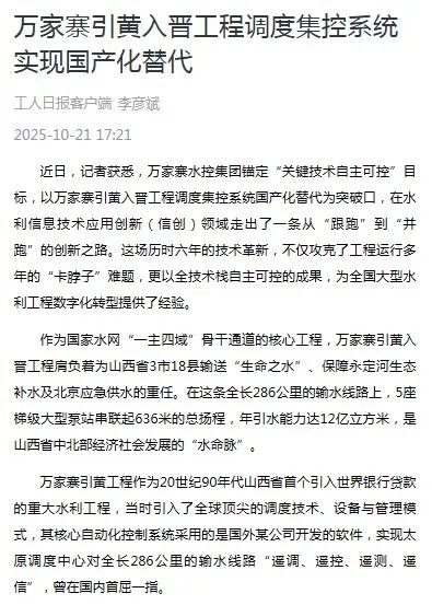 據了解,萬家寨引黃入晉工程自動化控制系統作為上世紀90年代山西省首個引入世界銀行貸款的重大水利工程,其核心自動化控制系統采用的是某外國公司開發的軟件。“隨著工程持續運行和調度要求不斷提高,原有系統逐漸暴露出諸多弊病,特別是關鍵設備和軟件依賴進口,存在潛在供應鏈安全風險。”萬家寨引黃水務集團擴機項目部計算機監控系統項目負責人張皓宇說,在硬件方面,關鍵組件嚴重老化,備件采購與技術服務成本居高不下,對進口依賴度高;系統軟件因泵站機組分三期建設,加之20多年來多批局部改造,系統的軟件架構、數據結構和工控協議不統一,多個系統形成“各自為戰”的信息孤島。