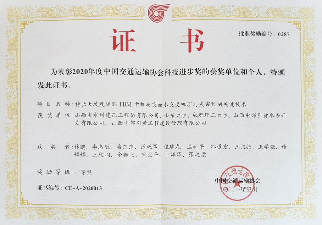 近日,水工局公司榮獲“2020 年度中國(guó)交通運(yùn)輸協(xié)會(huì)科技進(jìn)步獎(jiǎng)一等獎(jiǎng)”。