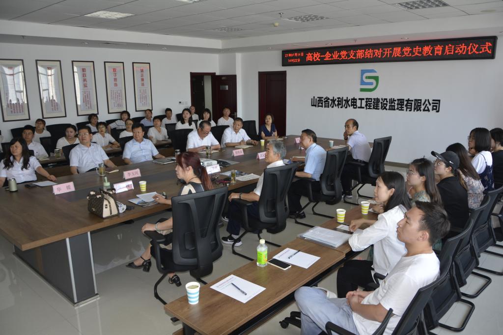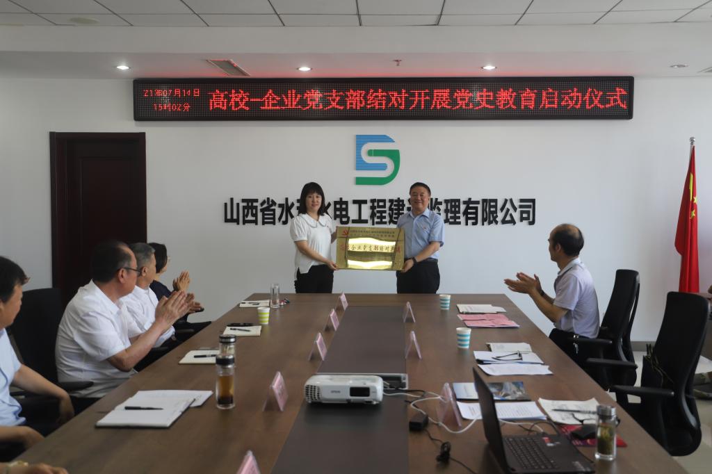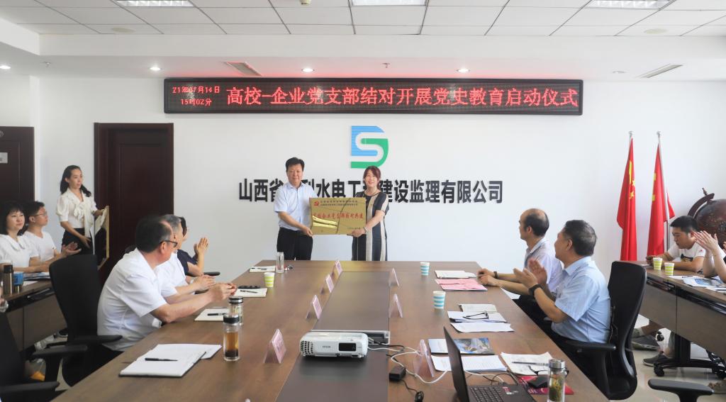 7月14日,水電監(jiān)理公司黨支部與山西應(yīng)用科技學(xué)院美術(shù)學(xué)院黨支部結(jié)對開展黨史學(xué)習(xí)教育啟動儀式在水電監(jiān)理公司舉行。水電監(jiān)理公司黨支部書記、董事長常民生,公司黨支部班子成員,山西應(yīng)用科技學(xué)院黨委副書記、紀委書記武定遠,美術(shù)學(xué)院第一黨支部書記董霞及雙方黨員共計60余人參加啟動儀式。常民生、武定遠分別為兩個支部授“高校企業(yè)黨支部結(jié)對共建”牌。