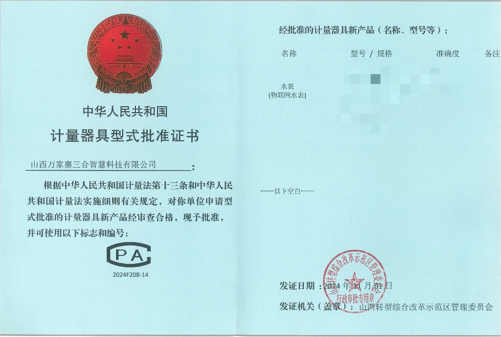 近日,裝備集團所屬萬家寨三合智慧科技公司成功獲得中華人民共和國計量器具型式批準(zhǔn)證書。這一權(quán)威認(rèn)證,標(biāo)志著萬家寨三合智慧科技公司在智慧水務(wù)及智能水表制造領(lǐng)域已達(dá)到國家標(biāo)準(zhǔn)要求,有利于提升公司產(chǎn)品的市場競爭力。