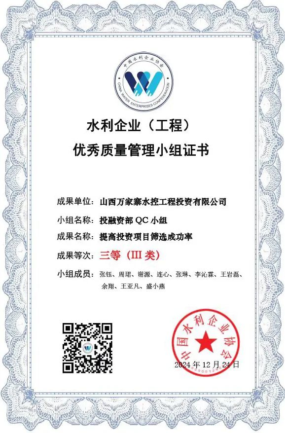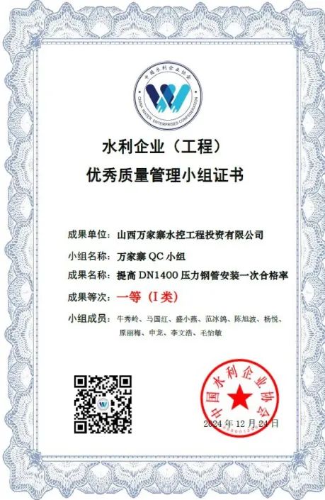 近日,中國水利企業(yè)協(xié)會公布的2024年度水利企業(yè)質(zhì)量管理小組競賽活動評價名單,工程投資公司報送的2項成果獲獎,其中《提高DN1400壓力鋼管安裝一次合格率》榮獲一等成果,《提高投資項目篩選成功率》榮獲三等成果。