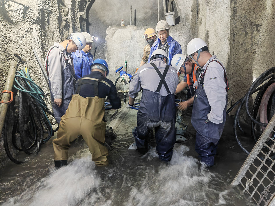 公司黨委將黨員先鋒隊作為加快推進剩余工程建設任務的有效抓手,以各參建單位黨員為班底,分別在東、西干線成立黨員聯合先鋒隊,以點帶面,有效激發一線黨員擔當精神,為項目建設與安全管理注入紅色動力。2025年9月4日凌晨3點42分,施工23標(續)9號支洞控制主洞段下游突發大規模涌水,瞬間,洞內水位迅速上漲,施工被迫中斷,工期面臨嚴峻挑戰。險情就是命令!公司第一時間啟動應急響應,黨員聯合先鋒隊迅速集結,奔赴搶險一線。注漿隊攜帶設備迅速對出水點進行封堵,后勤組緊急調配大功率抽排水設備,技術組實時監測水位,同步優化處置方案,“封堵-抽水-監測”的作戰體系高效運轉。