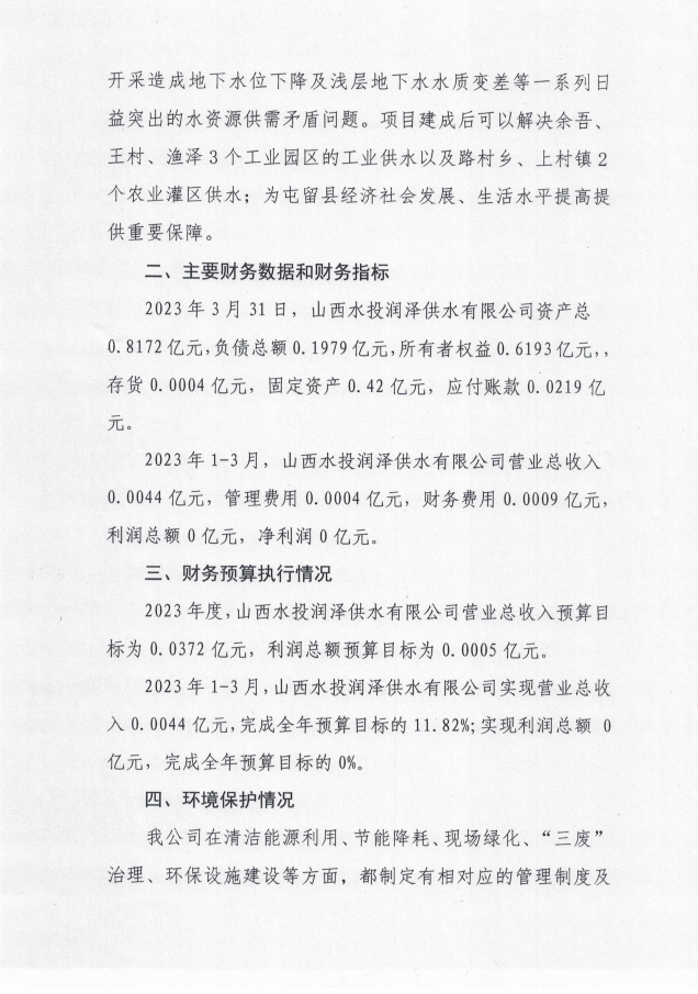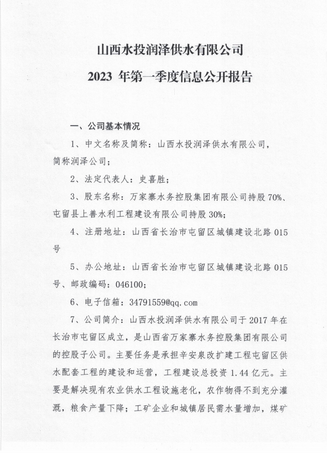 山西萬家寨水控水資源有限公司2023年第一季度信息...