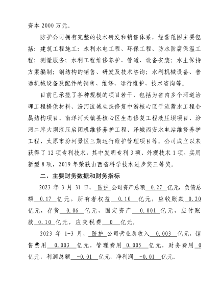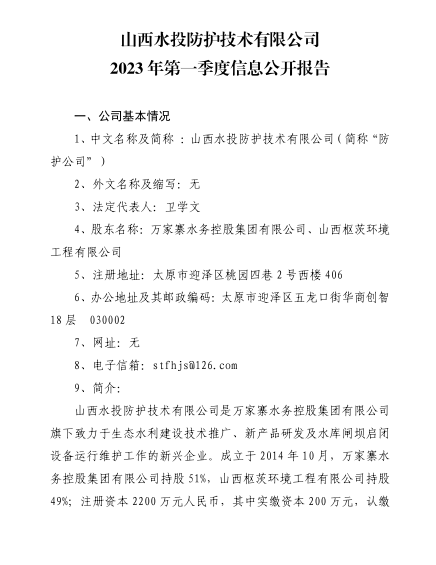 山西汾河流域管理有限公司2023年度第一季度信息公...