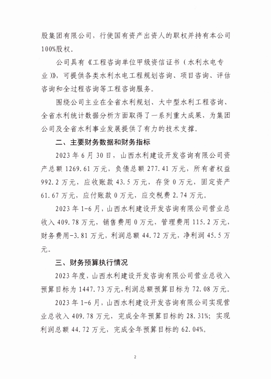 山西水務工程建設監(jiān)理有限公司2023年中期財務等重...