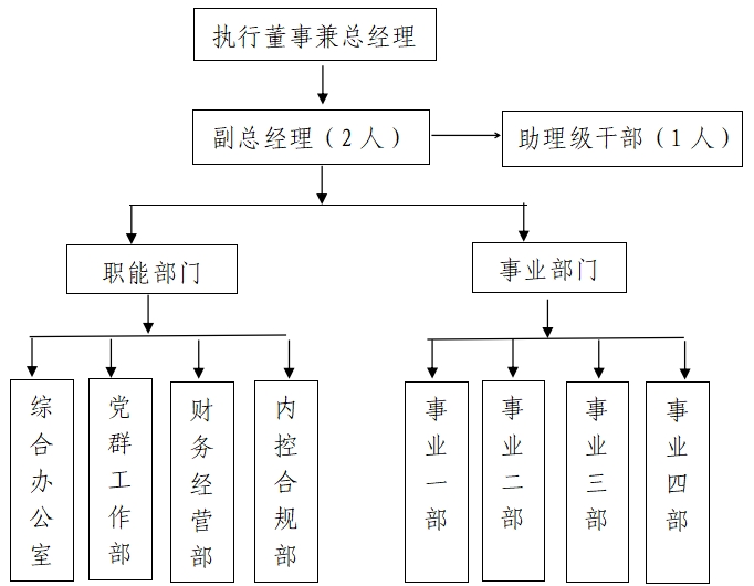 根據集團批復的“六定”方案,公司批復企業負責人3人(已配備1正2副),助理級干部1人(已配備總工程師),中層管理人員8正8副(已配備8正8副),內設職能部門4個,事業部門4個。