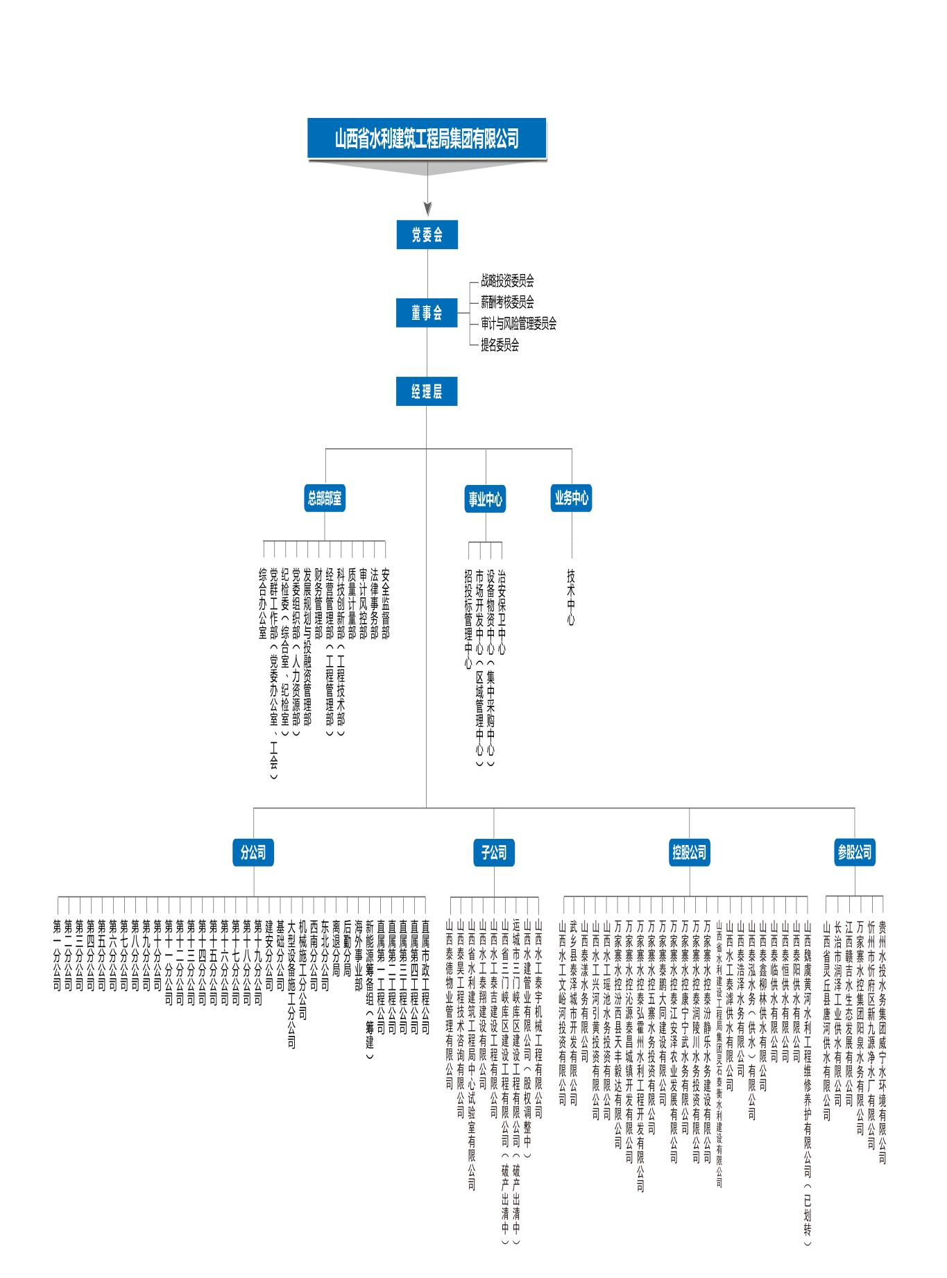 山西水工集團(tuán)下設(shè)12個(gè)部室、4個(gè)中心、32個(gè)分公司、9個(gè)全資子公司、23個(gè)控股公司,5個(gè)參股公司,此外有一個(gè)省級技術(shù)中心、后勤分局、離退分局,注冊資金15.5億元。信用等級AAA級,水利安全生產(chǎn)標(biāo)準(zhǔn)化一級,質(zhì)量、環(huán)境、職業(yè)健康安全整合型管理體系通過認(rèn)證。主要資質(zhì)為水利水電工程總承包特級,建筑工程施工、公路工程施工、市政公用工程總承包貳級。主營業(yè)務(wù)包括水利水電工程施工、工程項(xiàng)目管理、金屬結(jié)構(gòu)制作與安裝、爆破設(shè)計(jì)施工、安全評估、安全監(jiān)理、水利工程技術(shù)咨詢、水利工程檢驗(yàn)檢測等。