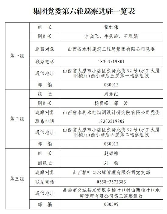 根據(jù)集團黨委巡察工作統(tǒng)一部署,3月3日至4日,集團第六輪巡察完成進駐,三個巡察組將以“一對一”形式對水工局集團、設(shè)計院公司、柏葉口水庫黨組織開展常規(guī)巡察;期間同步開展意識形態(tài)工作責任制落實情況和選人用人情況專項檢查。