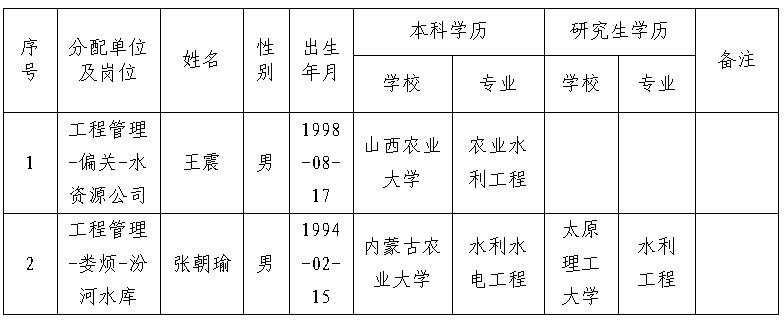 根據(jù)2023年2月20日發(fā)布的《萬家寨水務控股集團有限公司公開招聘專業(yè)技術(shù)人才公告》規(guī)定,經(jīng)筆試、面試、分配、體檢、考察等程序,于5月11-18日對第一批擬錄用人員進行公示,經(jīng)補充材料王震、張朝瑜2人符合要求,確定為擬錄用人員,現(xiàn)將2人情況進行公示。